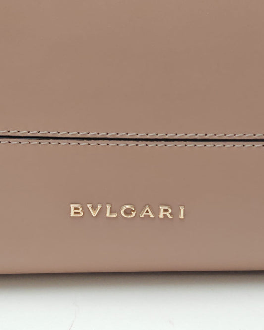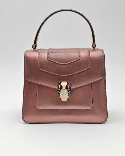 Bvlgari Serpenti Forever Top Handle Bag in Metallic Rose Leather with Gold Hardware.