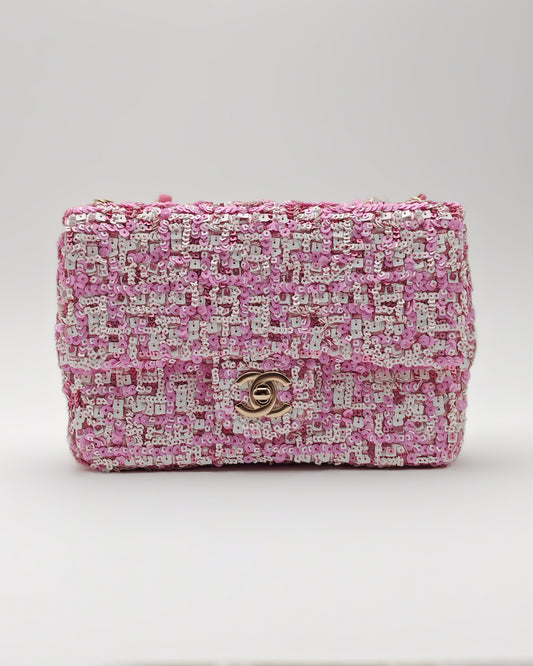 Chanel Mini Flap Bag in Pink Sequin Tweed with Gold Hardware.