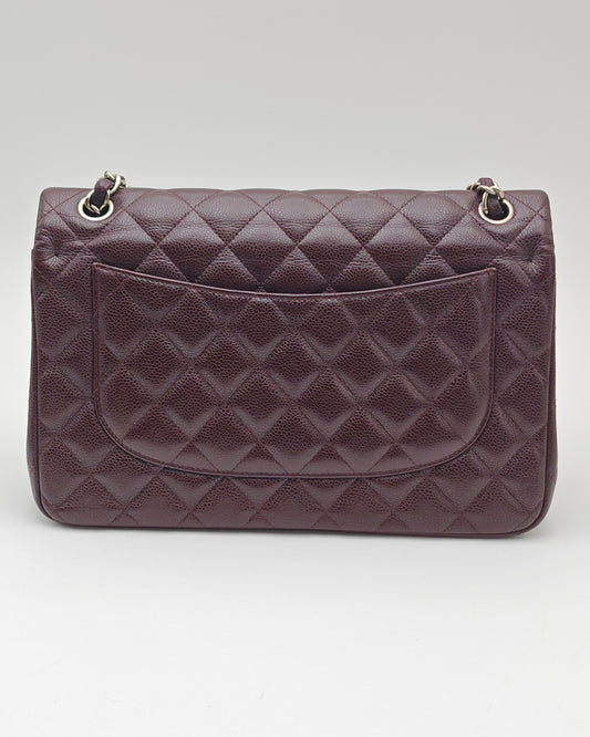 Chanel Classic Jumbo Double Flap Bag in Dark Burgundy Caviar Leather with Silver Hardware.
