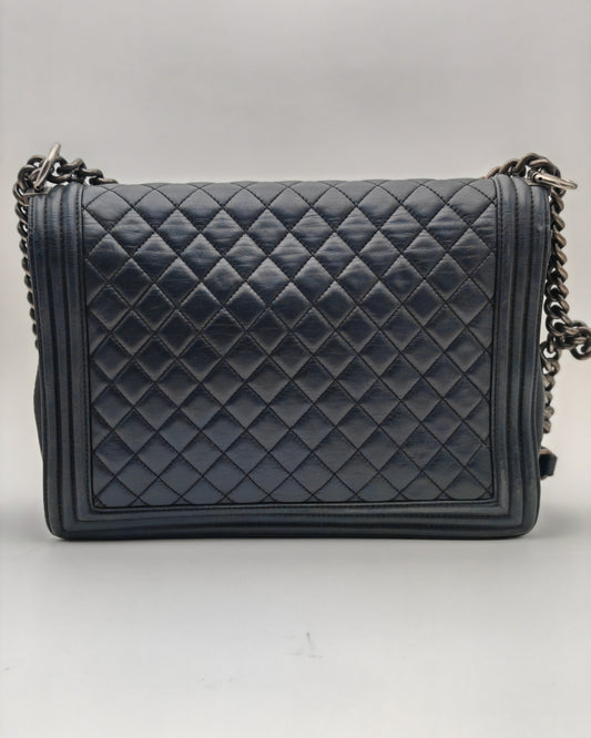 Chanel Boy Bag Large in Navy Quilted Calfskin with Ruthenium Hardware.