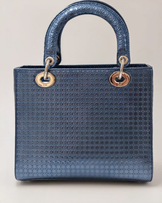 Christian Dior Lady Dior Medium Tote with Matching Wallet – Metallic Blue Micro Cannage Lambskin