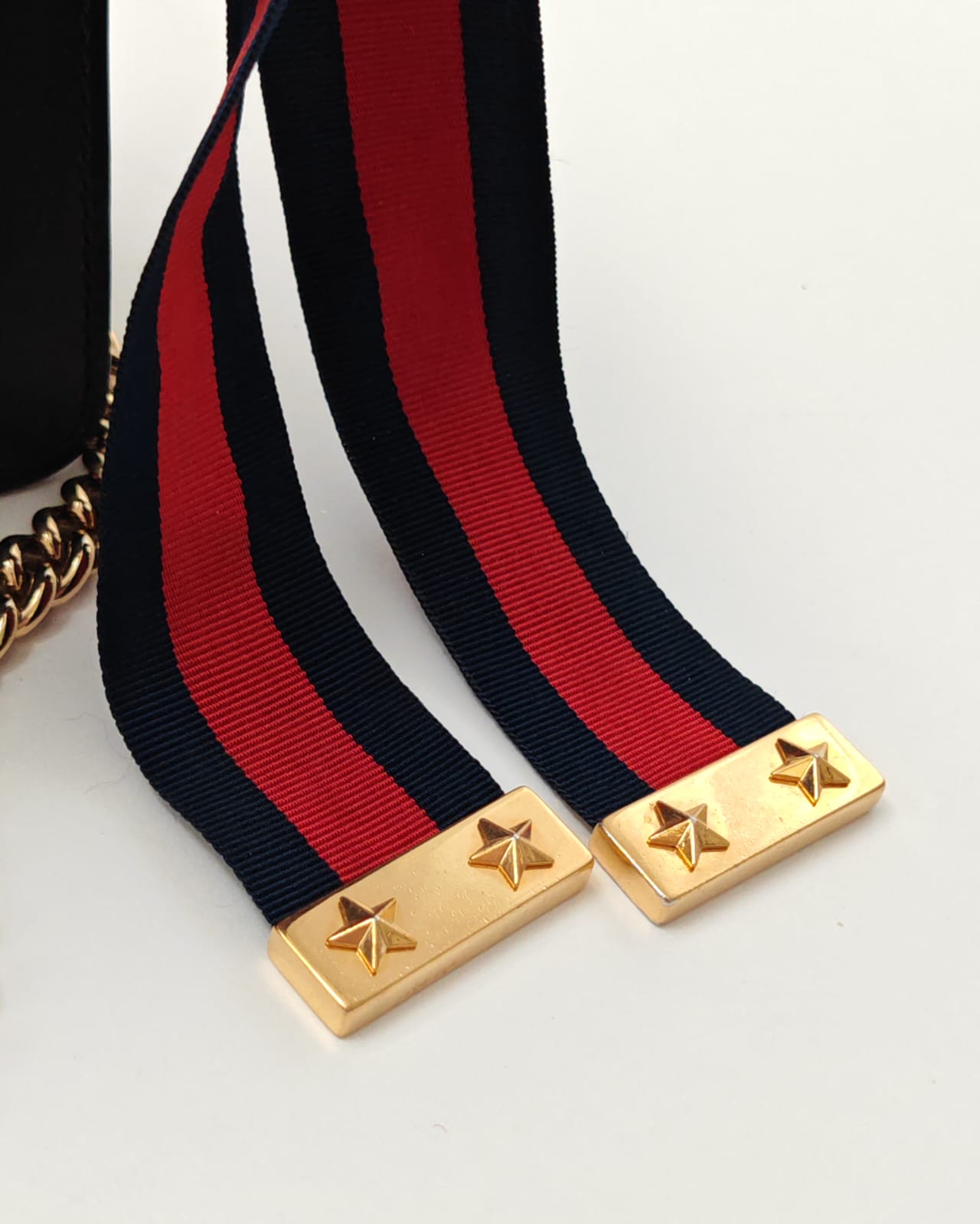 Chic and structured, this iconic Gucci Sylvie Mini Bag features smooth black leather, a signature green and red Web stripe, and gold-tone chain and buckle detailing. Finished with a detachable shoulder chain and a navy/red grosgrain ribbon bow, it’s a timeless piece with elegant flair.