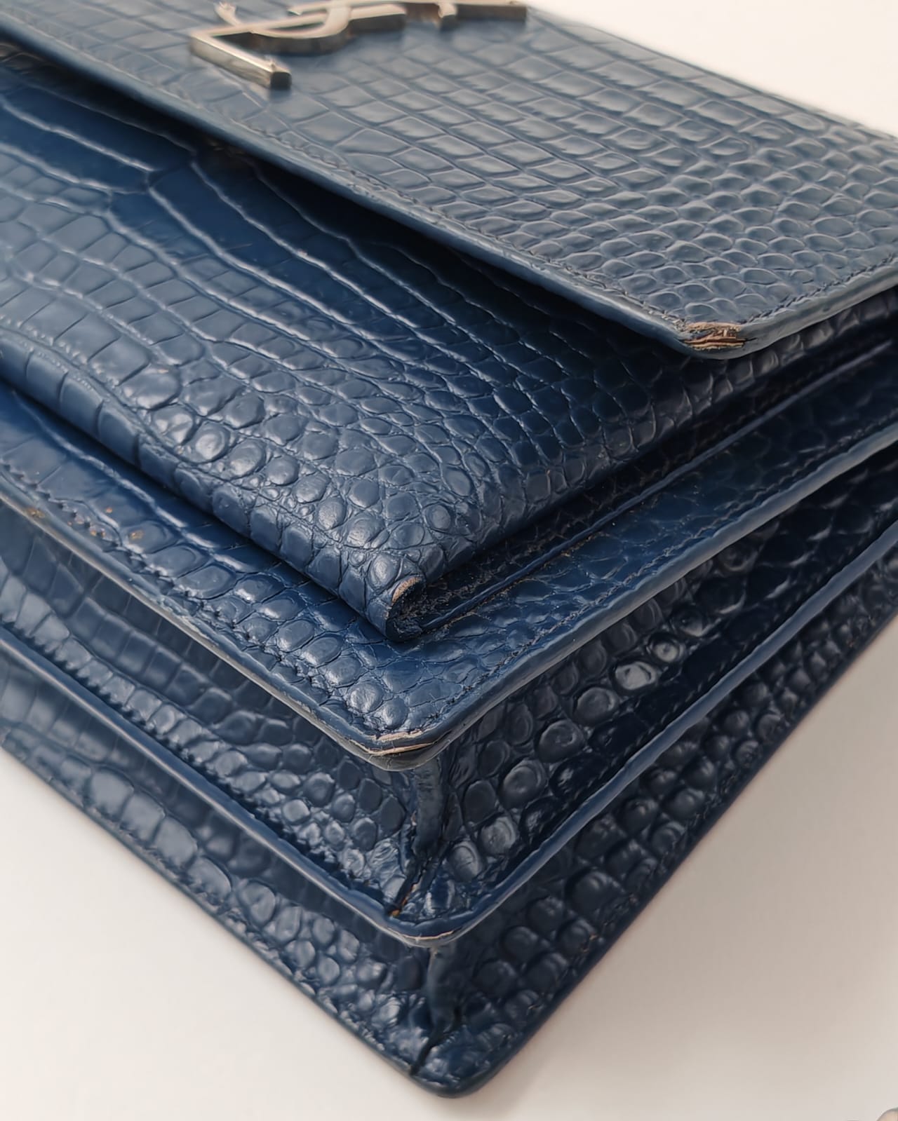 Elegant and timeless, this Saint Laurent Kate shoulder bag features luxurious croc-embossed leather in a deep navy blue tone, paired with silver-tone chain hardware and the iconic YSL monogram on the front flap. It includes a leather-padded shoulder strap for comfort and a magnetic snap closure.