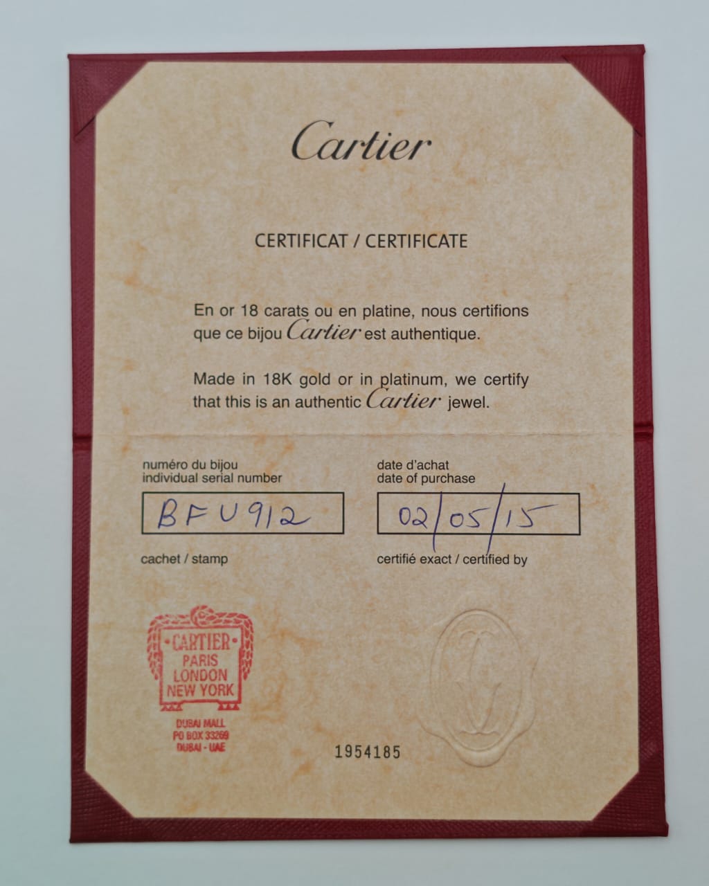 Date of Purchase 2 May 2015 (Cartier Boutique Dubai Mall)