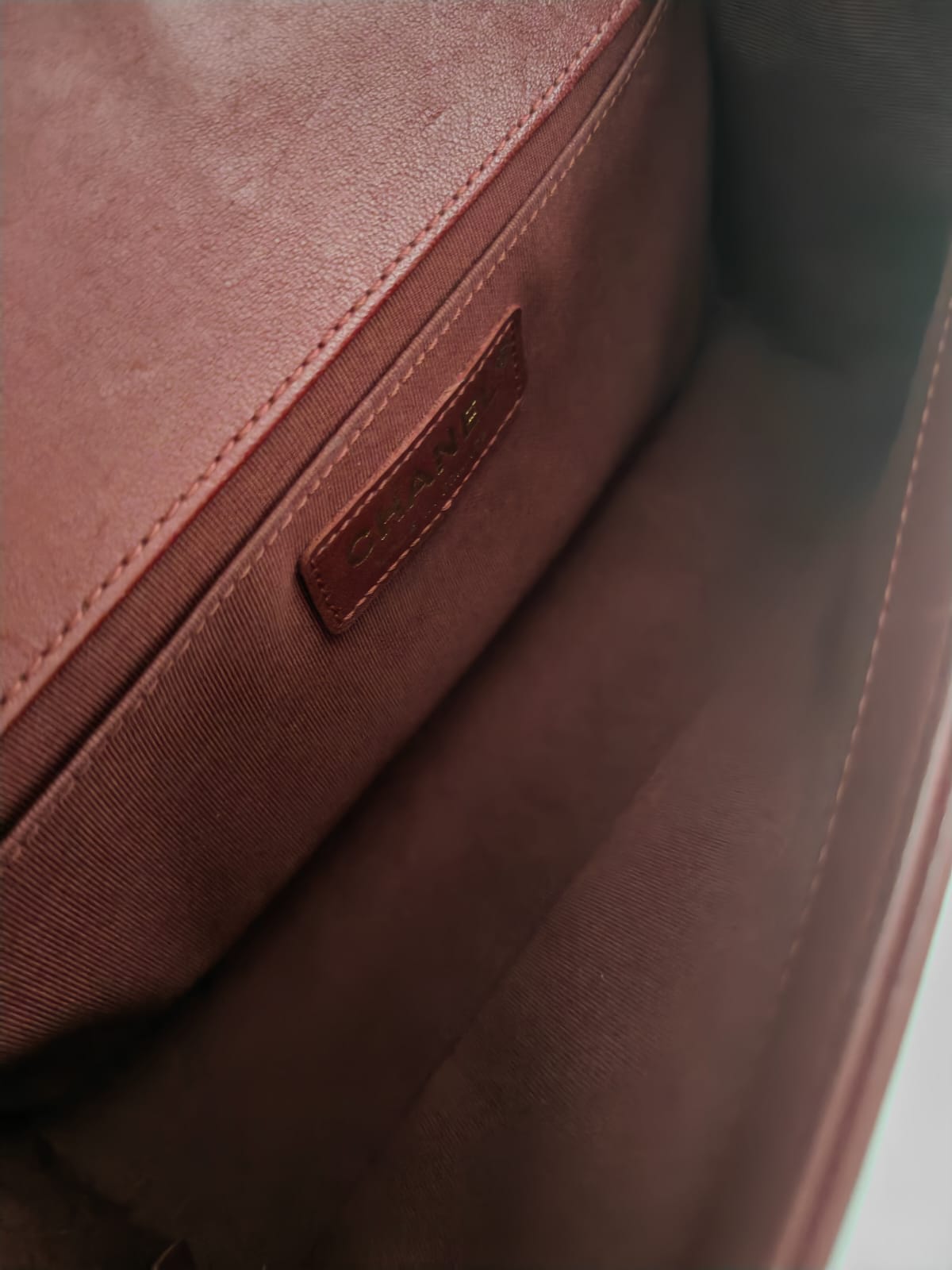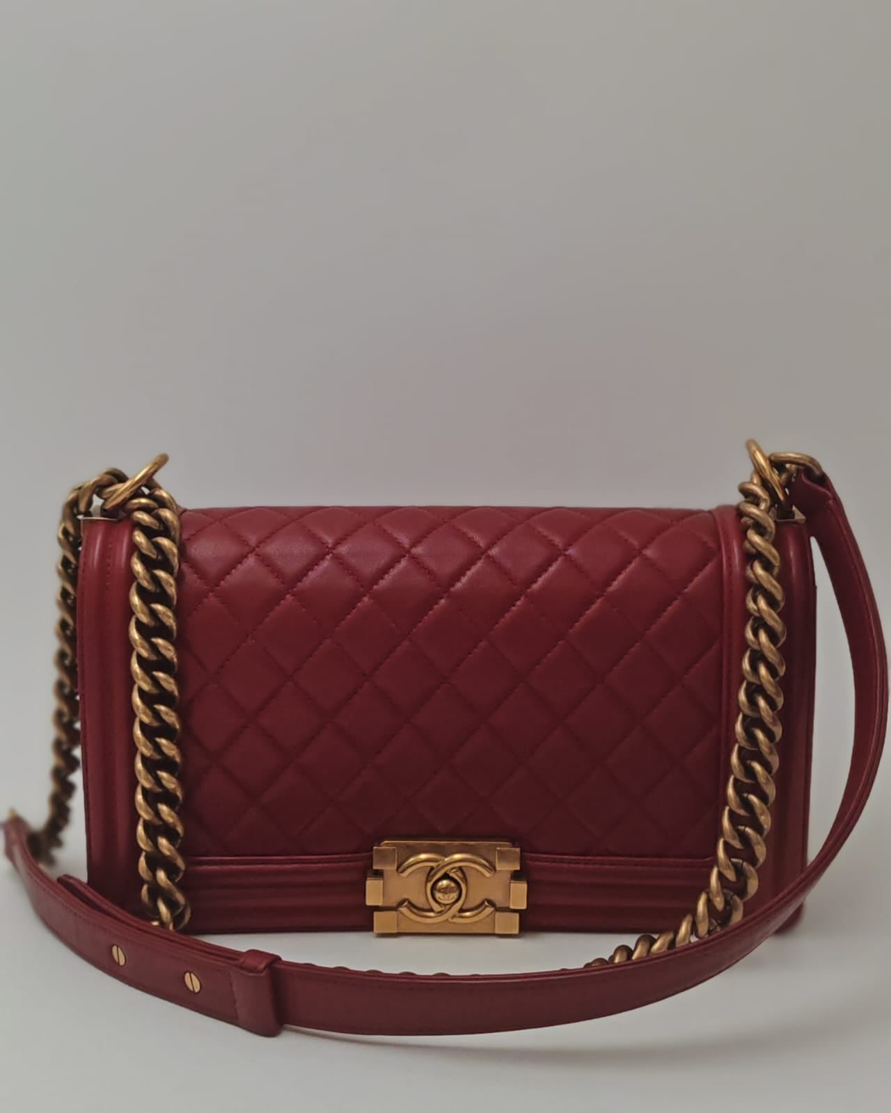 Bold, elegant, and unmistakably Chanel, this Old Medium Boy Bag is crafted from rich red quilted calfskin leather with smooth edge piping and ridged trim. The structured silhouette is paired with striking antique gold-tone hardware for a bold yet refined look.
