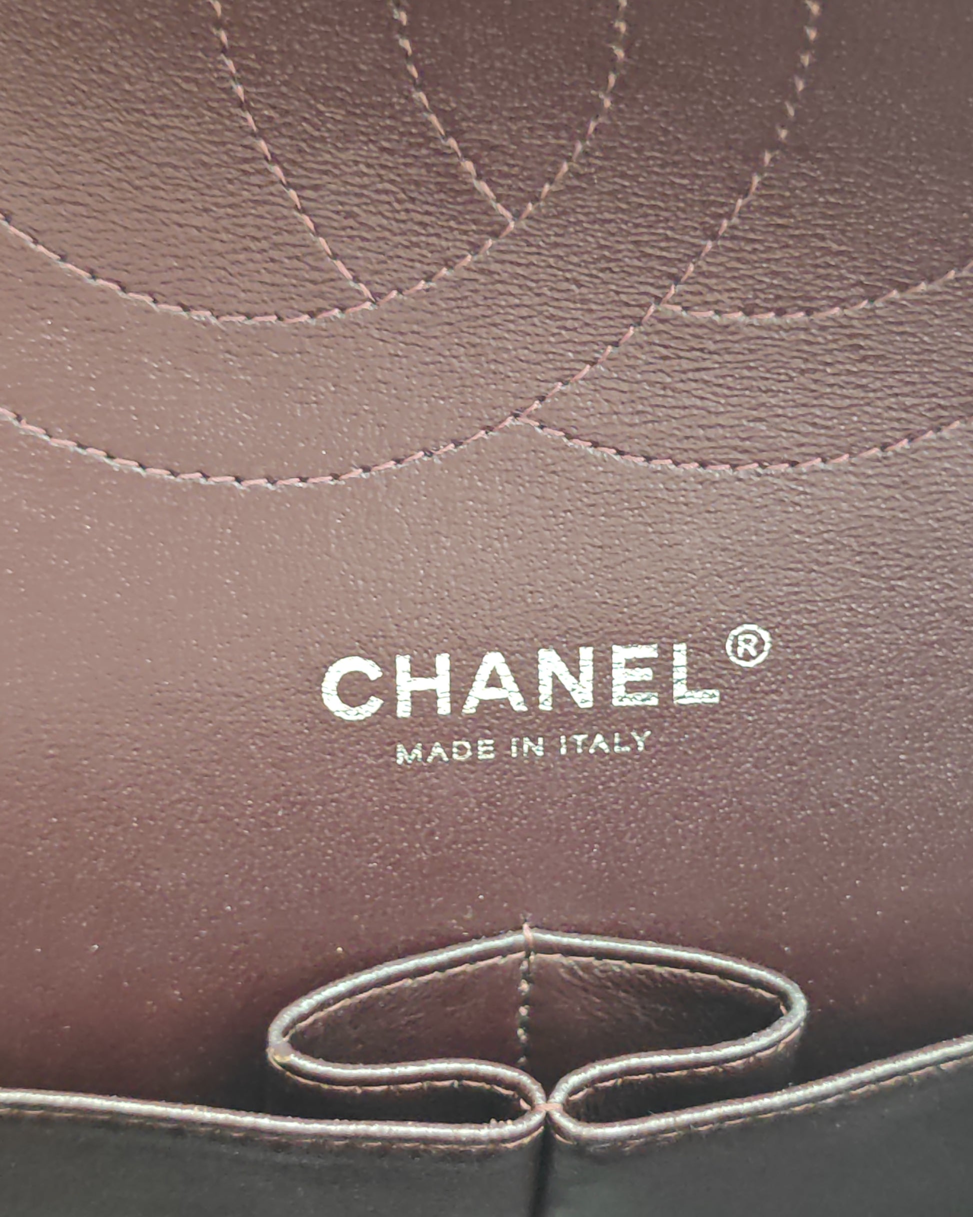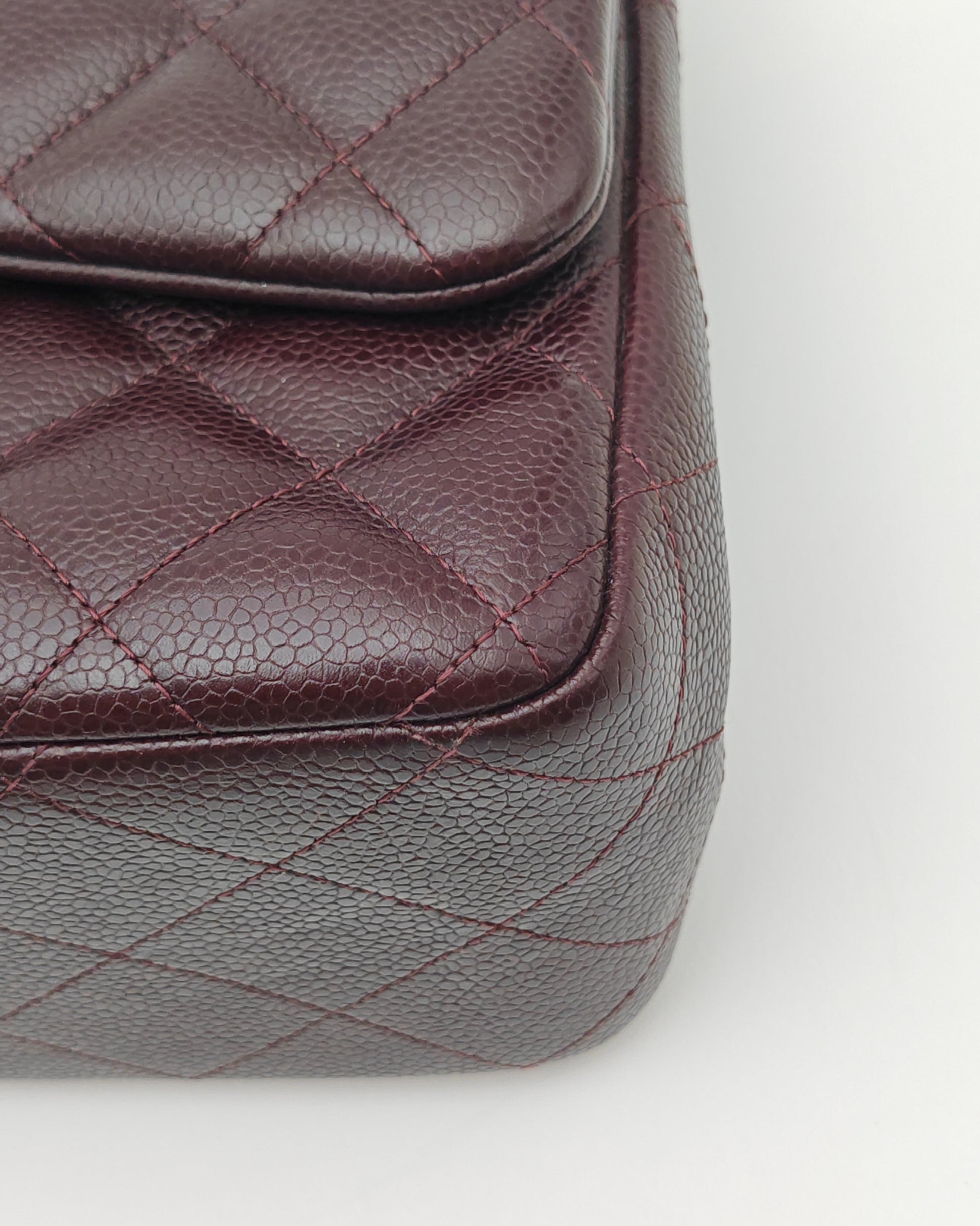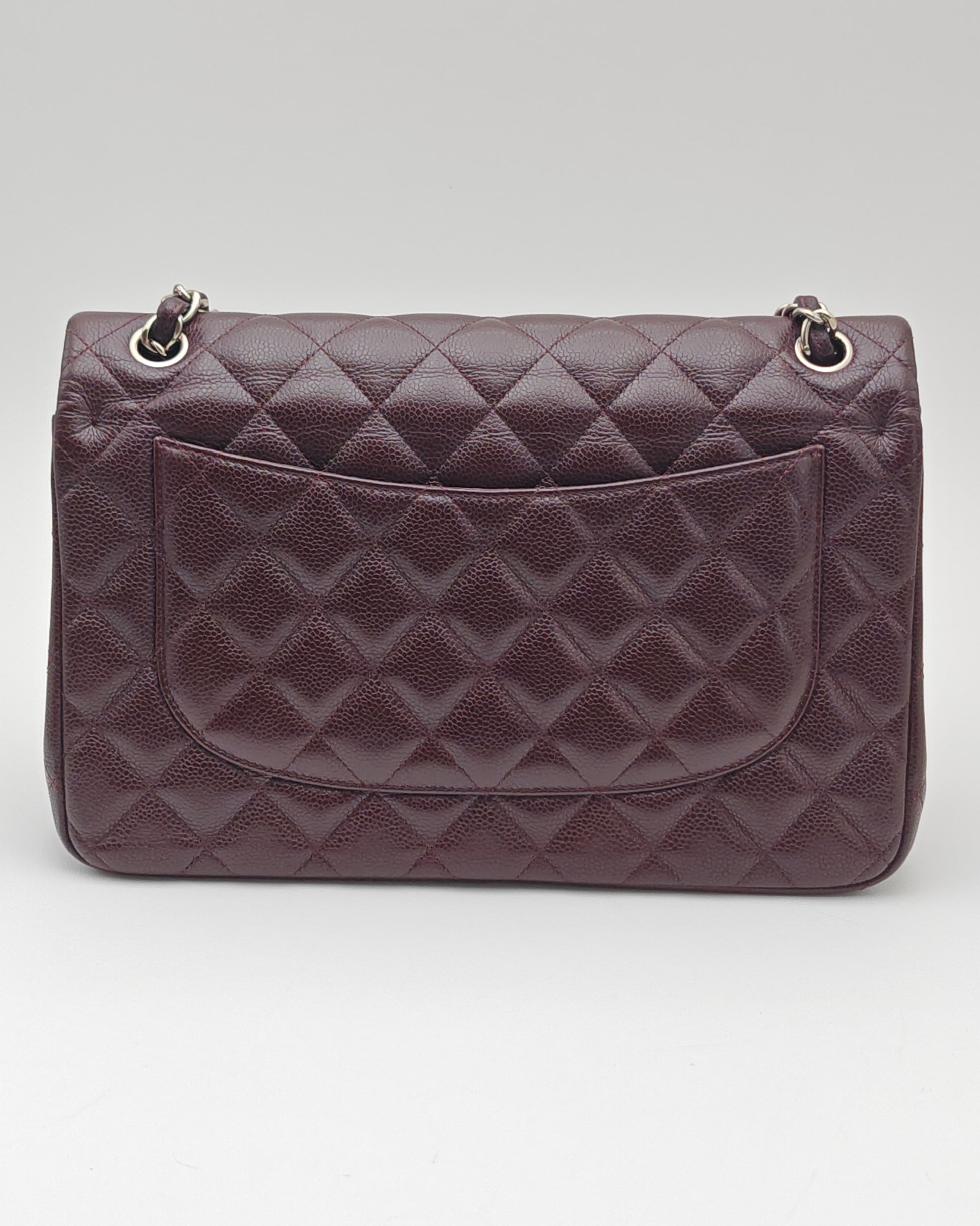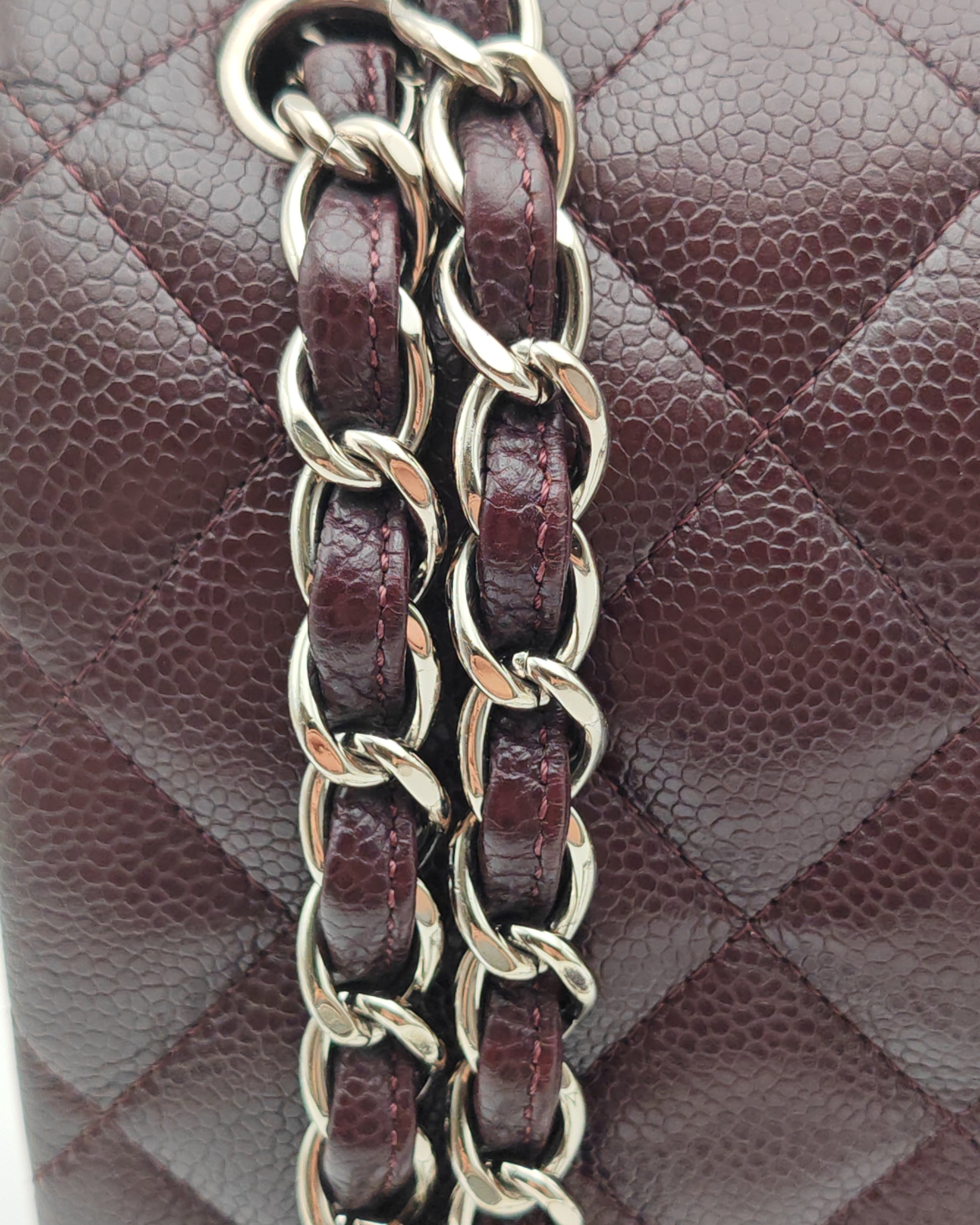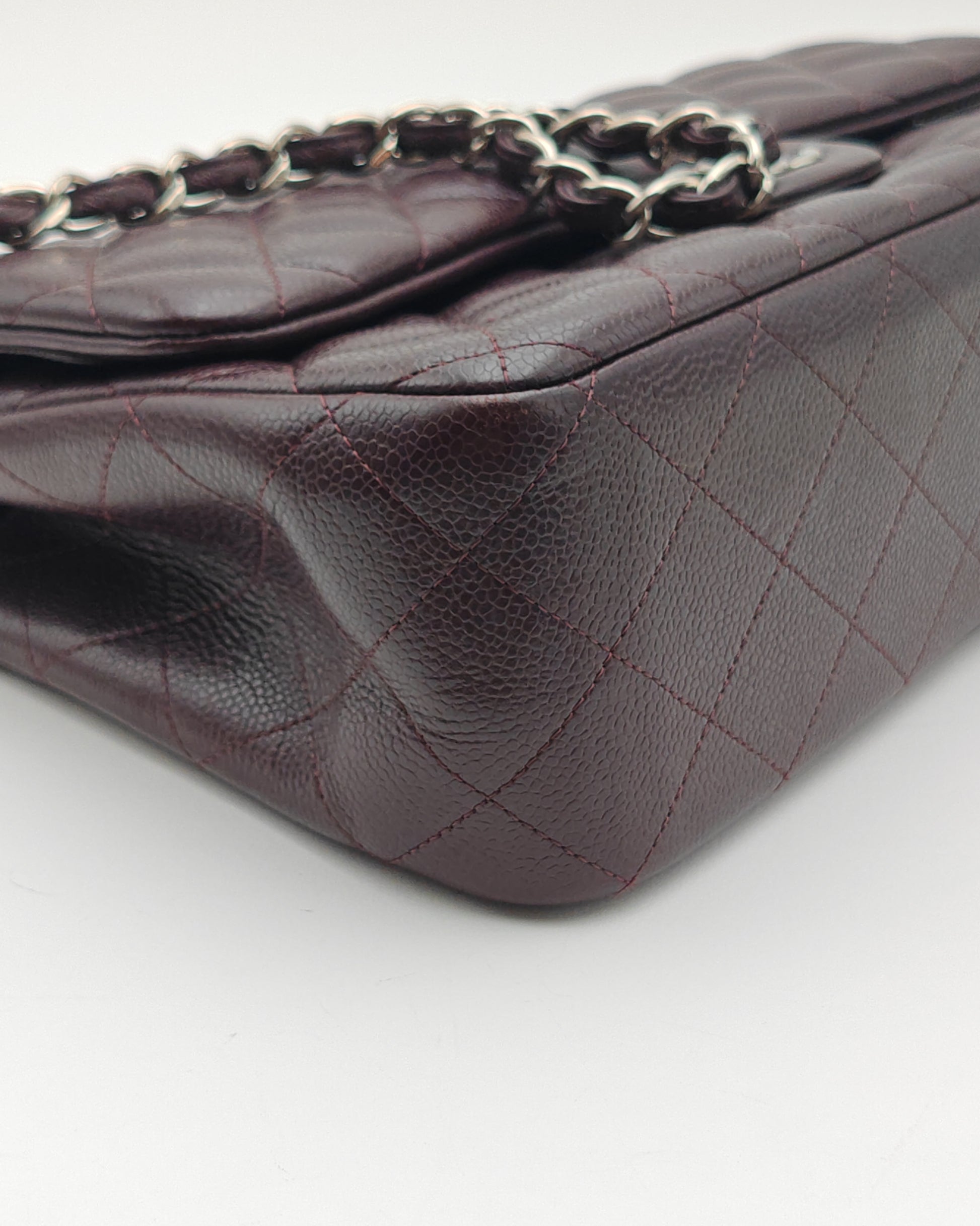 Chanel Classic Jumbo Double Flap Bag in Dark Burgundy Caviar Leather with Silver Hardware.