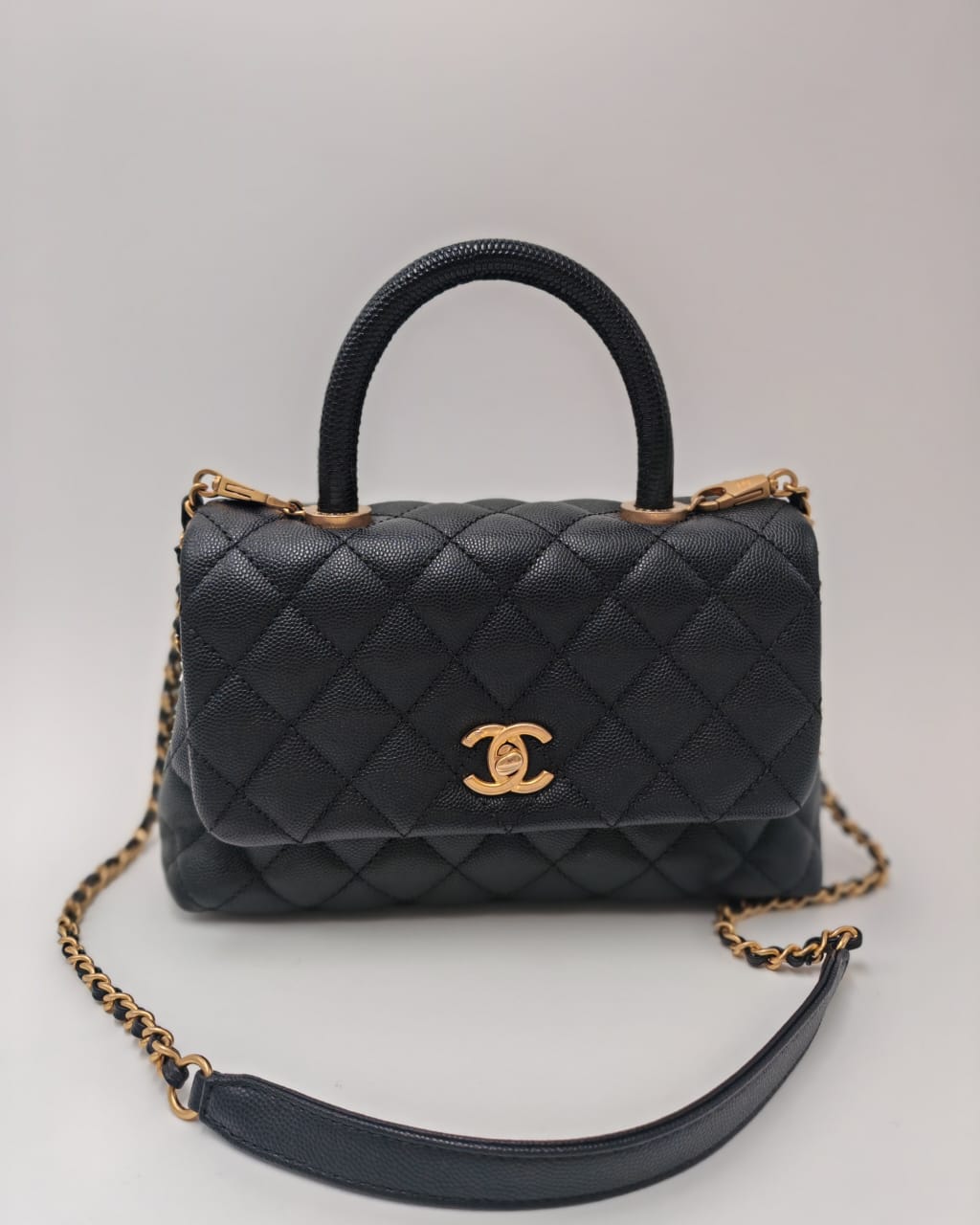 CHANEL Coco Handle Small Flap Bag in Black Caviar Leather with Gold Hardware