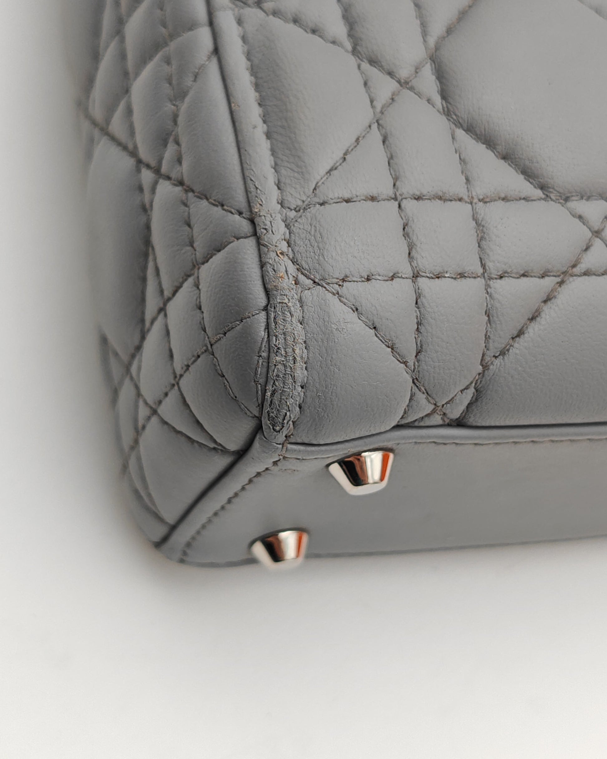 Iconic Lady Dior Mini in soft grey lambskin with Cannage stitching and silver-tone hardware. Comes with a detachable Dior strap embellished with multicolor crystals for a chic and modern twist. Compact, structured, and elegant — perfect for day-to-evening wear.