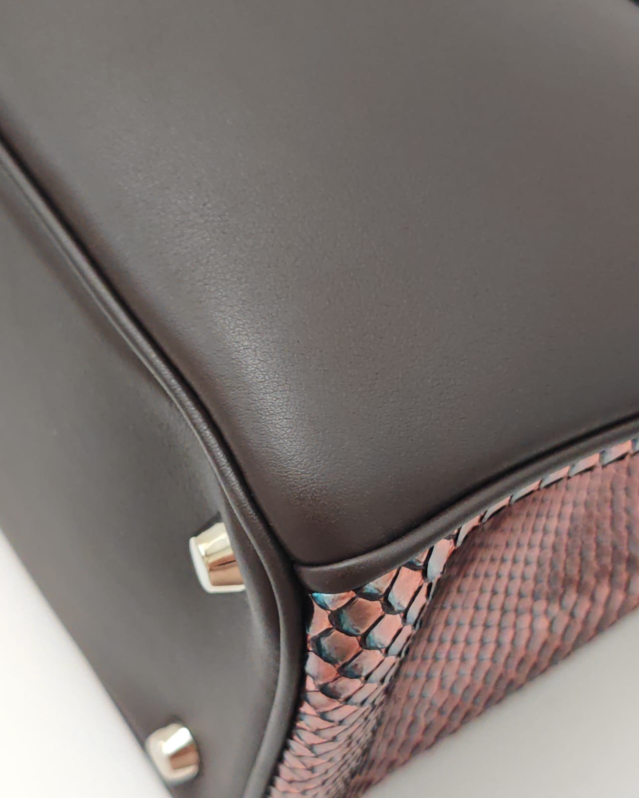Comes with a detachable and adjustable shoulder strap in brown calfskin with python detailing, allowing for crossbody or shoulder carry.