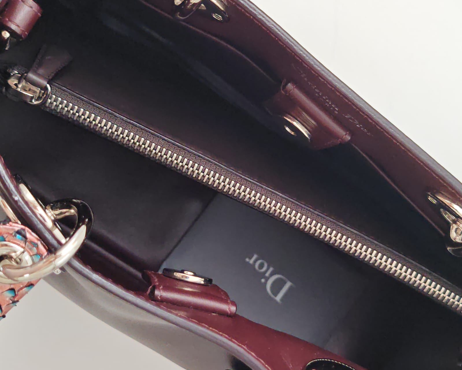 Crafted in dark burgundy calfskin leather with a contrasting pink interior, this Diorissimo Medium Tote is elevated by python top handles and a detachable strap. Finished with silver-tone hardware and the iconic “D.I.O.R” charms, it features a suede-lined interior with spacious compartments, blending timeless elegance with everyday practicality.