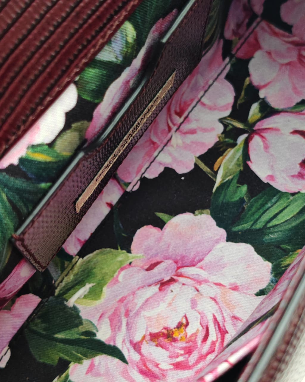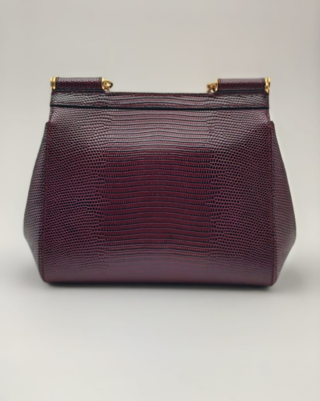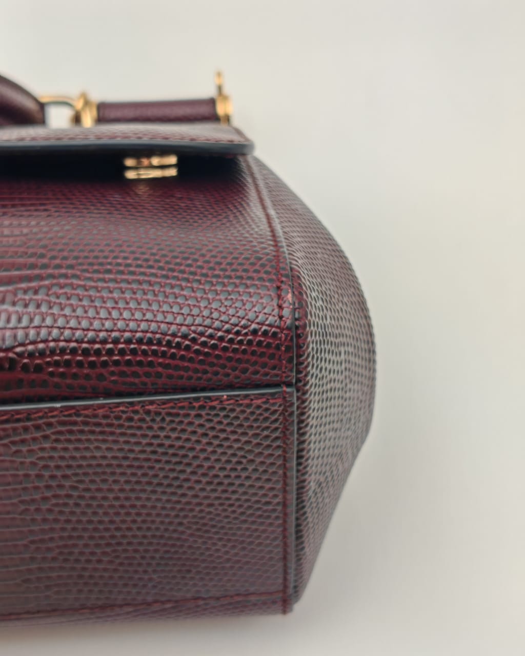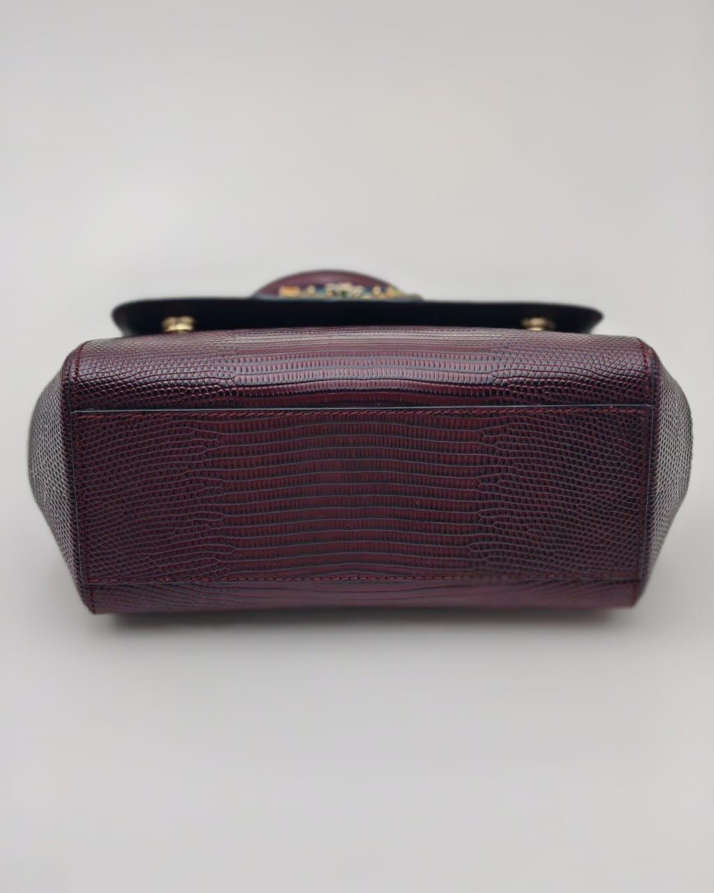 Dolce & Gabbana Sicily Small bag in burgundy lizard-embossed leather, featuring the iconic DG logo embellished with multicolor crystals. Finished with gold-tone hardware, floral-print lining, and a detachable strap for versatile wear.