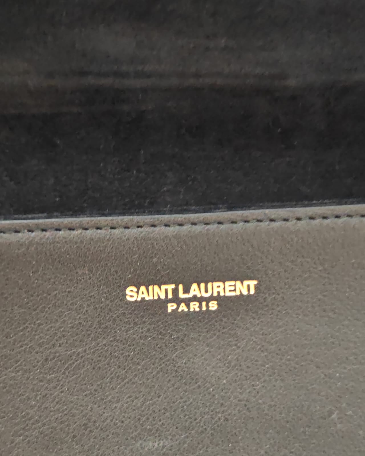 Interior: Black suede lining with gold-foil "SAINT LAURENT PARIS" logo